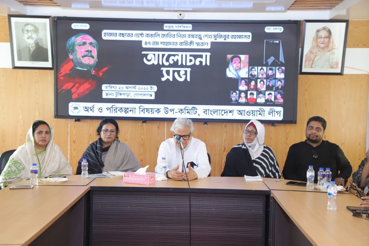 টুঙ্গিপাড়ায় জাতির পিতা বঙ্গবন্ধু শেখ মুজিবুর রহমানের সমাধিতে গতকাল (২৬শে আগস্ট) বাংলাদেশ আওয়ামী লীগের অর্থ ও পরিকল্পনা বিষয়ক উপ-কমিটির সদস্যরা পুষ্পস্তবক অর্পণ করে শ্রদ্ধা নিবেদন করেন। এরপর টুঙ্গিপাড়া উপজেলা কনফারেন্স হলে বঙ্গবন্ধু শেখ মুজিবুর রহমানের ৪৭তম শাহাদাত বার্ষিকী উপলক্ষে বাংলাদেশ আওয়ামী লীগের কেন্দ্রীয় অর্থ ও পরিকল্পনা উপকমিটির উদ্যোগে এক আলোচনা সভার আয়জন করা হয়। সভায় সভাপতিত্ব করেন মাননীয় প্রধানমন্ত্রীর অর্থনৈতিক উপদেষ্টা ও অর্থ ও পরিকল্পনা বিষয়ক উপ-কমিটির চেয়ারম্যান ড. মশিউর রহমান। সঞ্চালনা করছেন বাংলাদেশ আওয়ামী লীগের অর্থ ও পরিকল্পনা বিষয়ক উপ-কমিটির সম্পাদক ওয়াসিকা আয়েশা খান এমপি।